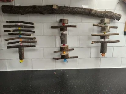 Les boules colorées sont également en bois et colorées avec une substance non toxique. Ce n'est donc pas un problème si les animaux les rongent ou les mangent.