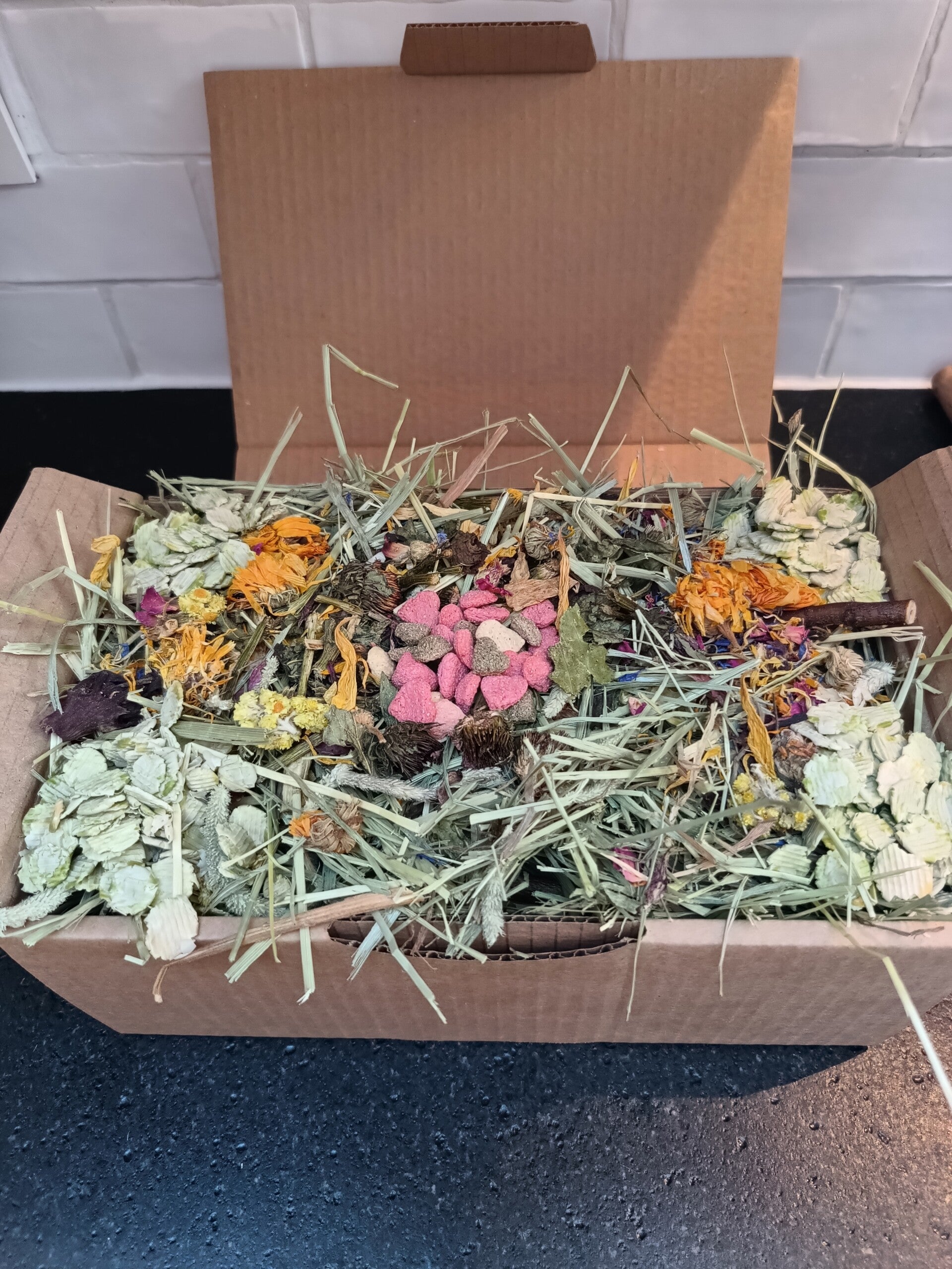 Bestaat uit: Timothy hooi, echinacea, bloemenmengeling, erwtenvlokken, linde takjes en knapperige hartjes.