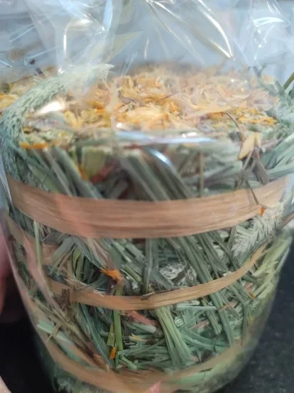 Hele leuke hooirol: mooi groen Timothy hooi, met als topping 4 verschillende smaken.