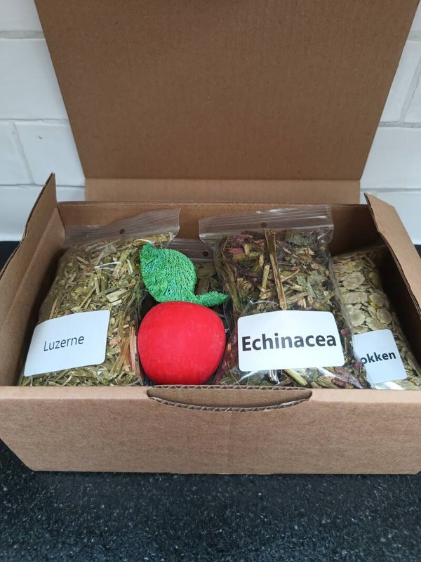 Weegbree, echinacea, Luzerne, appelbladeren, rozenblaadjes, kruidentuin, erwtenvlokken, johannesbrood en een houten appel met loofah blaadje.