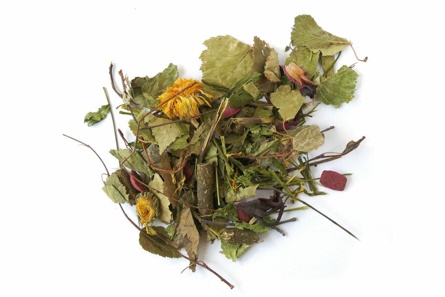 Peterseliestengels, aardpeerkorrels, berkenbladeren, wortelblokjes, dillestelen, weidegraskorrels, smalle weegbree, pepermuntstengels, echinacea, rode biet, hibiscusbloesems, mix (blokjes pastinaak, wortelen, bieten-, peterseliewortel-, selderij),
