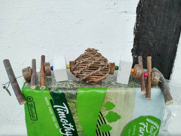-Kerstkrans van wilgenhout, gevuld met Timothy hooi, goudsbloem en rozenblaadjes. Deze kan opgehangen worden in het verblijf.