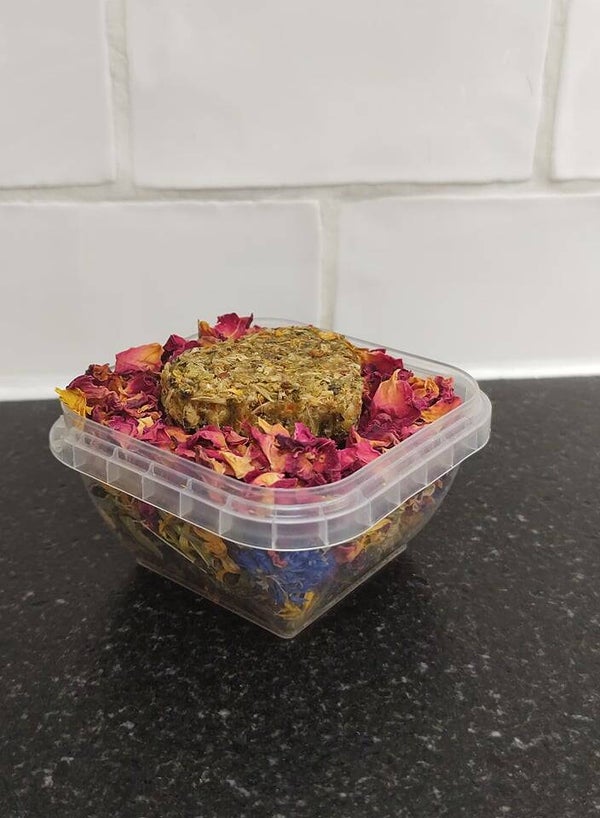 Bestaat uit: Hartje van goudsbloem of rozenblaadjes, rozenblaadjes, aardbeienbladeren en bloemenweide (groene haver, peterselie, kamille, roosjes, zonnebloemblaadjes, korenbloem en echinacea).
