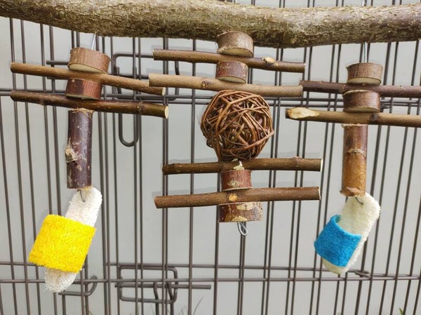 De grote tak (zie foto 2) is een gedroogde hazelnoottak. Deze is +- 57 a 58 cm lang! Hieraan zijn 3 korte speeltjes bevestigd.